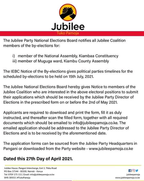 Members of the national assembly kiambaa constituency and member of county assembly muguga ward, kiambu county to be held on 15th july, 2021.